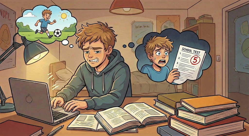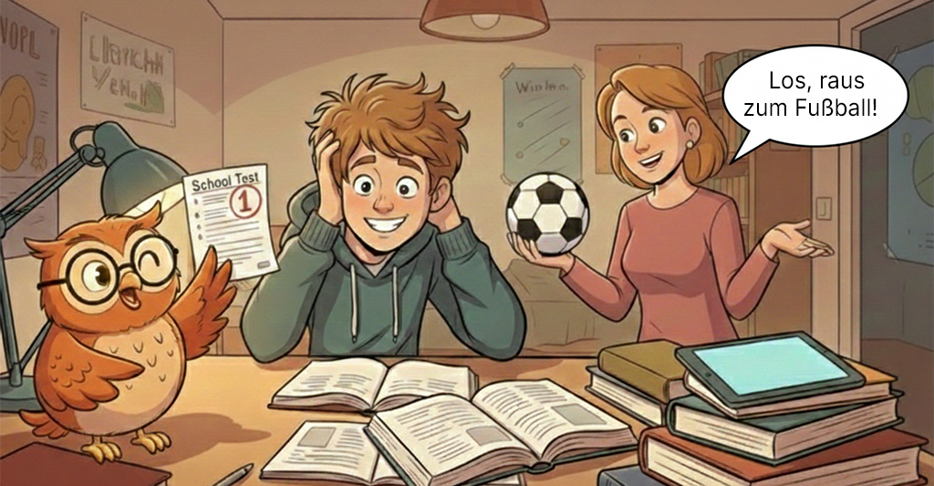 Max will seine Hausaufgaben so schnell wie möglich fertigbekommen, damit er raus kann zum Fußball. Also lässt er sie von einer herkömmlichen KI erledigen, die ihm sofort das Ergebnis präsentiert. Die Hausaufgaben bekommt Max so zwar gemacht, aber bei der Schularbeit - da fällt er durch.