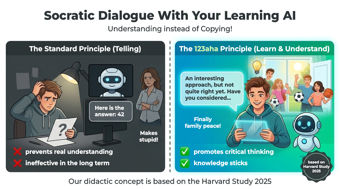 - Future Skills: With 123aha.com, students learn how to constructively use artificial intelligence, which represents one of the most important key qualifications for the future. Banning AI is definitely the wrong approach. Students should absolutely use AI to develop. However, it is crucial that the AI promotes learning instead of simply presenting solutions.